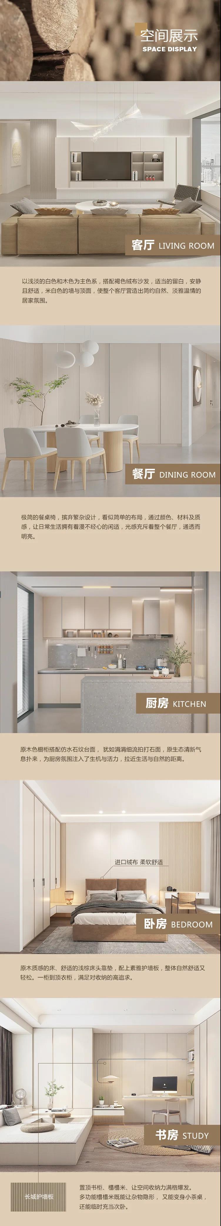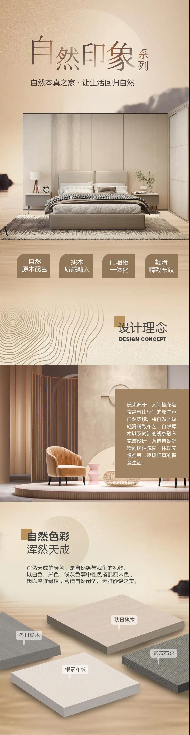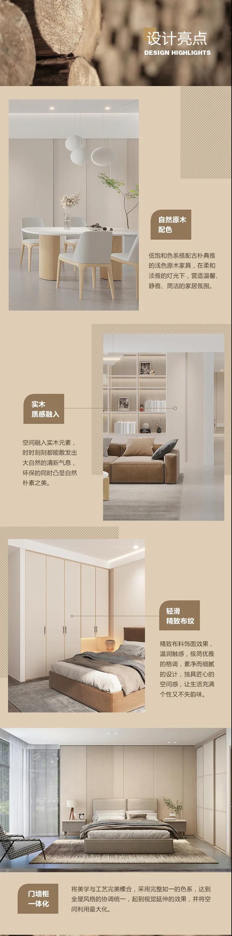 灵感来源于“人闲桂花落,夜静春山空”的原生态自然环境。将自然木纹、轻滑精致布艺、自然原木以及简洁的线条融入家装设计,营造自然舒适居住氛围,体现无惧拘束,返璞归真惬意生活。