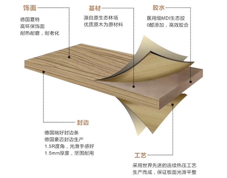 抖圈清新板,臻选原生态林场,以优质原木为原料,生产过程中采用MDI胶作为胶黏剂。MDI胶,高分子合成材料,具有不含甲醛、力学强度和耐水性好等优点,广泛用于国防、航天、医疗等领域,是目前全球环保性能最优的粘合剂之一。