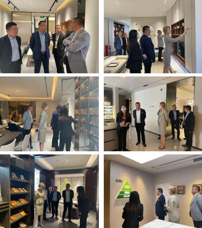 随后,月星家居欧总一行参观抖圈轻奢馆,在参观了解过程中,用心聆听讲解人员对展厅空间的介绍,细心感受每一处产品细节,并对抖圈的生产工艺、创新设计、环保等级等方面进行了详细了解和深入交流,对抖圈线下终端门店的展示和体验赞叹不已。