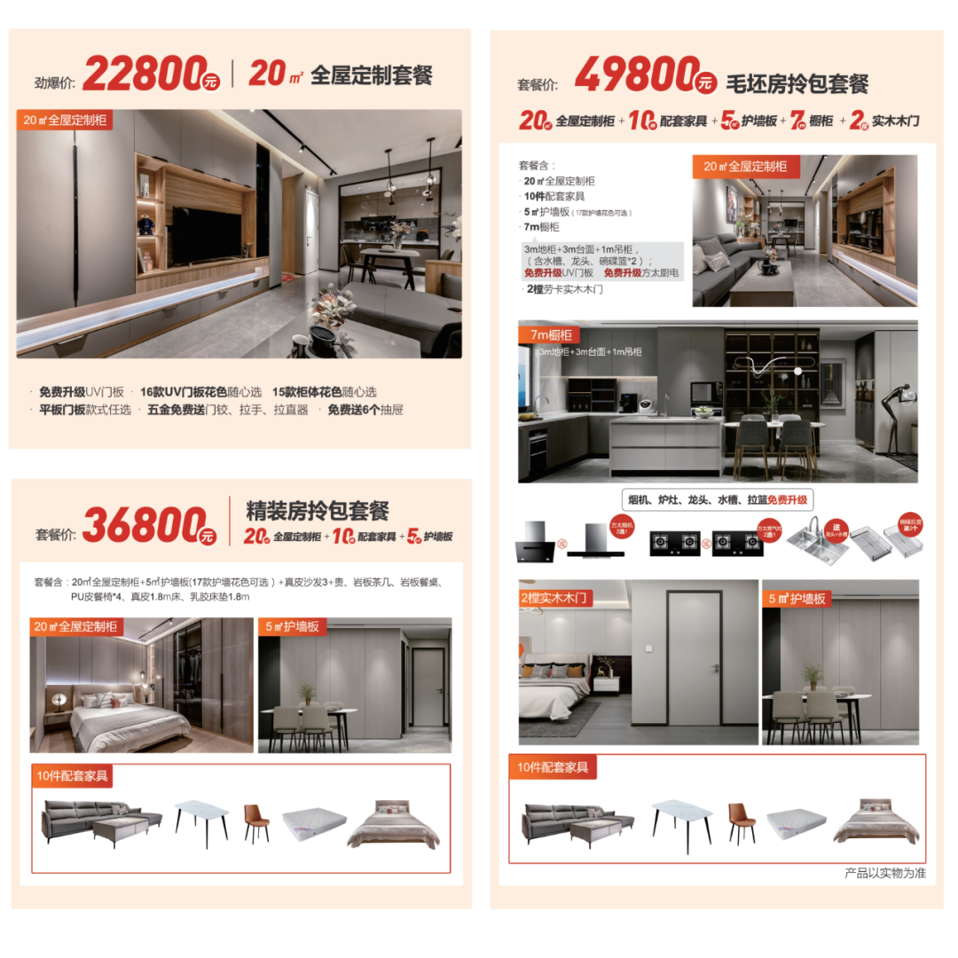 除了创新性的定位外,抖圈的价值还体现在其套餐细节上,先看其套餐,针对不同的消费人群推出三档不同价位的套餐:22800元全屋定制套餐包括20㎡全屋定制柜;36800元精装房拎包套餐,包含20㎡全屋定制柜+10件配套家具+5㎡护墙板;49800元毛坯房套餐,含20㎡全屋定制柜+10件配套家具+5㎡护墙板+7m橱柜+2樘实木木门。